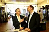 Jonas Gahr Støre gir ordet til Trong Giske under en livesending i Operapassasjen under Arbeiderpartiets partilokaler på Youngstorget i Oslo.
