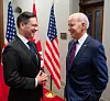 Pierre Poilievre i samtale med Joe Biden under et besøk i Ottawa i 2023. Canadieres motstand mot Bidens etterfølger, Donald Trump, skaper trøbbel for Poilievres politiske fremtid.