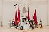 Rødstrømpenes fremste mål var kvinnefrigjøring fremfor likestilling. Den danske kunstneren Lene Adler Petersens praksis ble synlig i dette landskapet på 60-tallet gjennom en rekke politiske konseptuelle verk, installasjoner og performancer som alle undersøkte representasjoner av kvinner i samtiden. Et av disse setter både standarden og stemningen der det står plassert ved utstillingens inngang. Tingene, din historie, befri dig for tingene (1976) er en installasjon av ting – gjenstander knyttet til hjemmet og kvinnens klassiske plass i det, i all hovedsak den tredje K-en; kjøkken. Et kjøleskap, en ovn full av boller, blomsterpotter, serveringsfat, strykejern, sengetrekk og syltetøyglass, for å nevne noe. Alt ligger i en haug på gulvet, vaskekoster står oppreist med rødt stoff festet på de lange skaftene så de ser ut som flagg eller faner. På toppen av det hele står en modell av kunstneren selv med neven knyttet og motivet er umiskjennelig likt Eugène Delacroixs historiemaleri Friheten fører folket (1830). Det ikoniske maleriet viser Marianne, personifiseringen av friheten og symbol på Den franske republikk i det som er en hyllest til Julirevolusjonen i 1830, der hun leder an folket over barrikadene med brystene hengende ute, et gevær i den ene hånden og det franske flagg i det andre. I Petersens versjon er barrikaden et sammensurium av husholdningsartikler og kvinnen på toppen er klar til å marsjere fra det hele, ut av hjemmets sfære og inn i det offentlige rom – ingen liten revolusjon bare det.