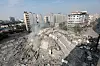 Palestinians inspect the ruins of Watan Tower destroyed in Israeli airstrikes in Gaza city, on October 8, 2023. Fighting between Israeli forces and the Palestinian militant group Hamas raged on October 8, with hundreds killed on both sides after a surprise attack on Israel prompted Prime Minister Benjamin Netanyahu to warn they were "embarking on a long and difficult war". Photo by Naaman Omar\ apaimages