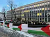 Demonstranter har etterhvert lært seg hvilken inngang stortingsrepresentantene bruker når de går på jobb. Bak bygningen var det stort oppmøte idag av folk som krever at Norge innfører sanksjoner mot Israel. Anledningen var at en rekke representantforslag ble debattert i nasjonalforsamlingen.