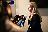 Julie Brodtkorb blir intervjuet av pressen utenfor høringssal 1 i komitéhuset på Stortinget.