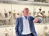 Christian Ringnes på kontoret foran sin samling med drikkehorn